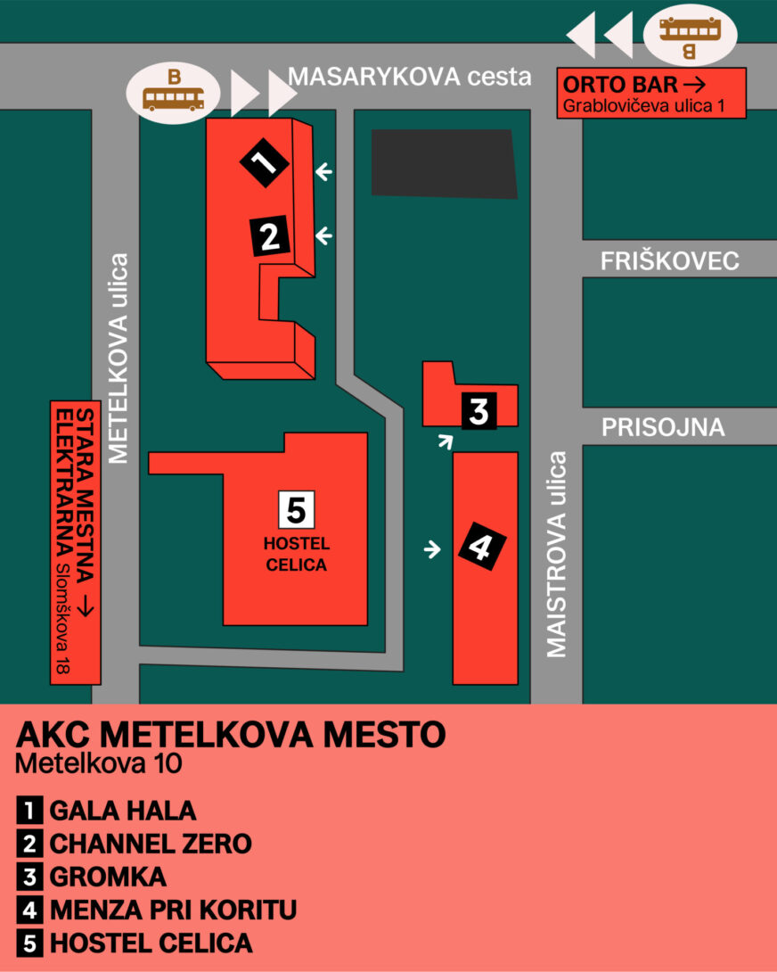(Metelkova: Channel Zero, Gala hala, Gromka & Menza pri koritu. V bližini Stare mestne elektrarne.)